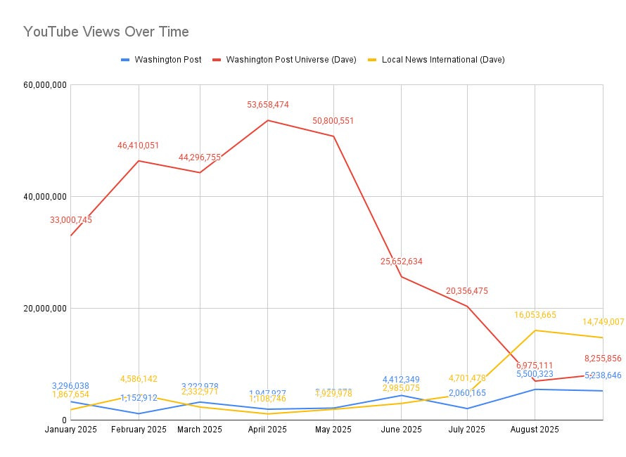 It tracks what happened to YouTube when the Washington Post’s TikTok star Dave Jorgenson left. “Washington Post Universe”, the Post’s channel run by Dave, peaked at ~53.7M views in April and slid to ~8.3M by August; Jorgenson’s new channels climbed in the same window.