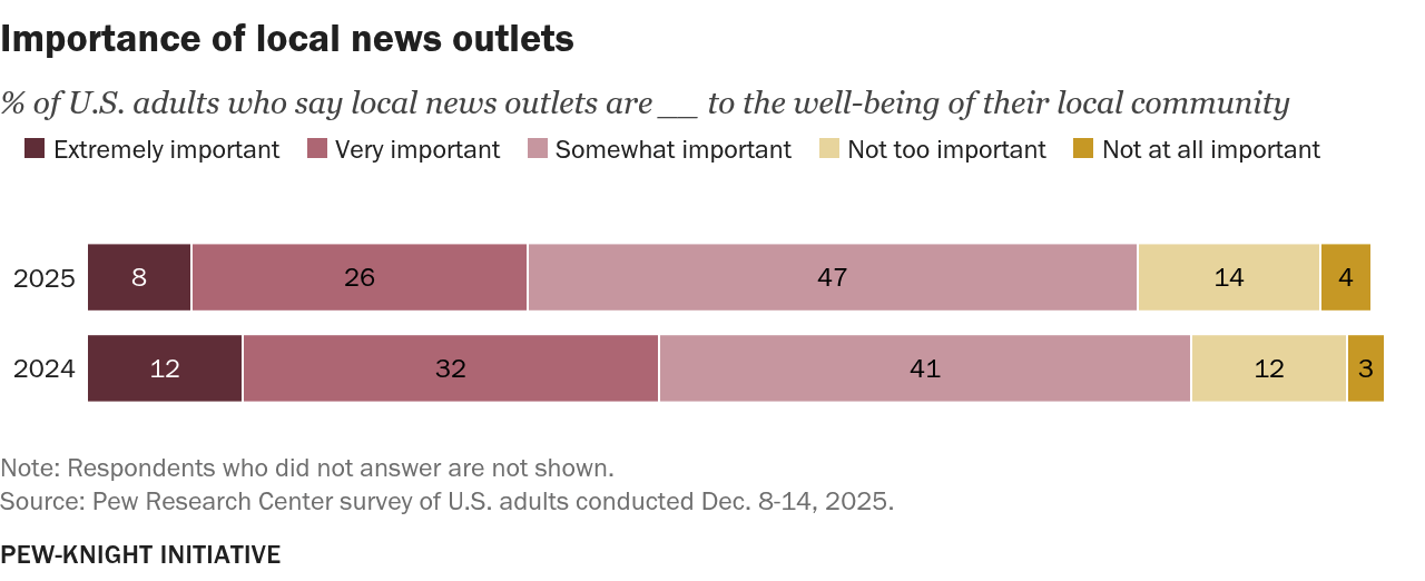 Perceived importance: eroding at the top. Eight in ten Americans still say local news is at least somewhat important to their community, but that broad agreement conceals a sharper shift: the share who say it is extremely or very important dropped from 44% to 34% in a single year.