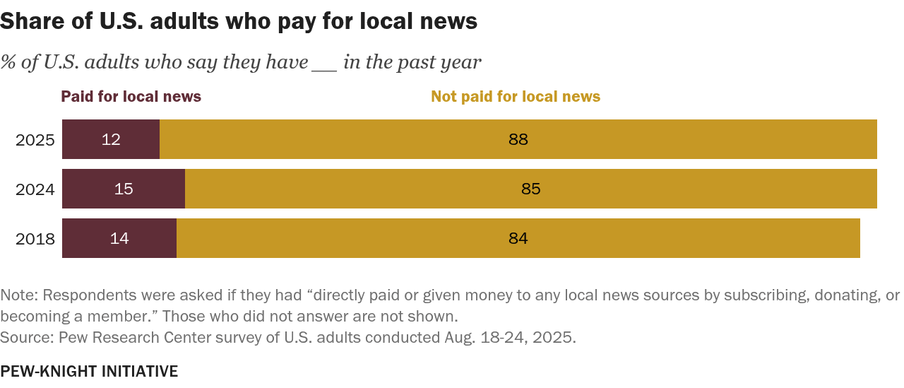 Paying: remains the exception, and it is not growing. Only 12% of U.S. adults paid or donated to a local news source in the past year, a three-year low and roughly the same as in 2018. Among those who haven’t paid, half say they can find enough for free, and a growing share (29%, up from 26% in 2018) say they are simply not interested enough. Price is the least-cited barrier. The willingness-to-pay problem is not a pricing problem.