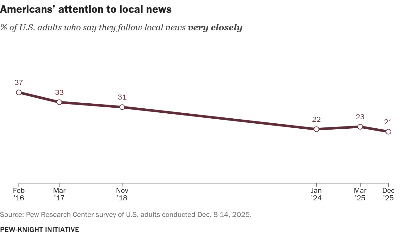 Attention: down by half. In 2016, 37% of Americans followed local news very closely. By the end of 2025, that share had fallen to 21%. This indicator has moved steadily downward for nearly a decade, mirroring a broader retreat from news generally. A less attentive audience is a harder monetize, regardless of how the ask is framed.